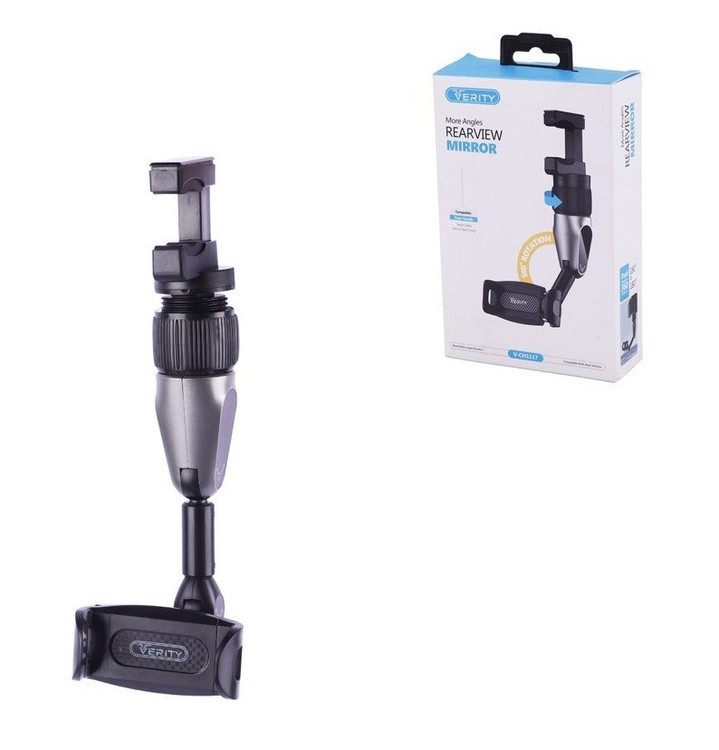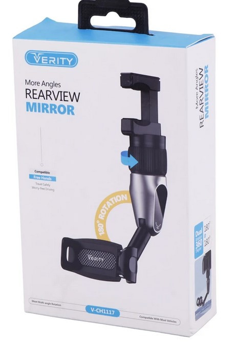 نگهدارنده گیره ای آینه خودرو وریتی مدل V-CH۱۱۱۷ بدنه محصول ساخته شده از جنس پلاستیک مقاوم در برابر آسیب های فیزیکی همچون فشار و ضربه نحوه اتصال به گوشی موبایل به صورت گیره ای، مجهز به دو حالت تنظیم زاویه ۱۸۰ درجه ای در بازو پایه از نوع گیره ای قابل نصب بر روی آینه خودرو، دارای کلید چرخشی جهت تنظیم ارتفاع بازو موفق به کسب گواهینامه استاندارد امنیت و سلامت محصولات شامل CE / FCC / RoHS