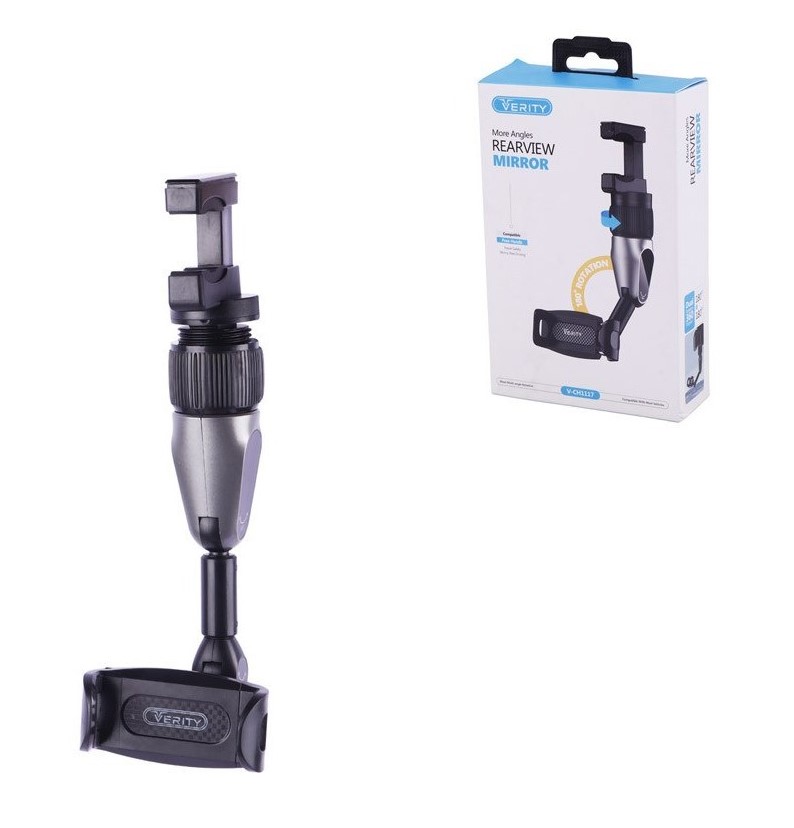 نگهدارنده گیره ای آینه خودرو وریتی مدل V-CH۱۱۱۷ بدنه محصول ساخته شده از جنس پلاستیک مقاوم در برابر آسیب های فیزیکی همچون فشار و ضربه نحوه اتصال به گوشی موبایل به صورت گیره ای، مجهز به دو حالت تنظیم زاویه ۱۸۰ درجه ای در بازو پایه از نوع گیره ای قابل نصب بر روی آینه خودرو، دارای کلید چرخشی جهت تنظیم ارتفاع بازو موفق به کسب گواهینامه استاندارد امنیت و سلامت محصولات شامل CE / FCC / RoHS