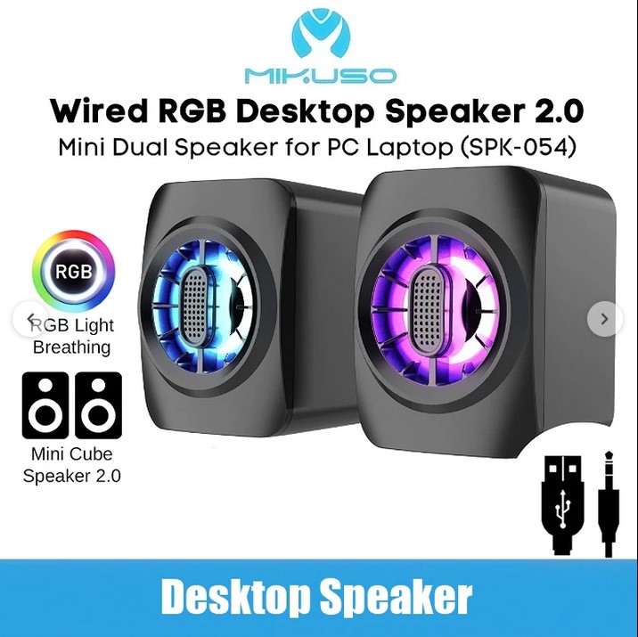 اسپیکر رومیزی و قابل حمل میکاسو دارای طراحی کوچک و جمع و جور با صدای واضح، شفاف و بدون نویز می باشد. این محصول از طریق سیم و با رابط جک 3.5 میلیمتری به کامپیوتر و لپ تاپ شما متصل می شود. تامین برق این محصول از طریق درگاه USB می باشد. این اسپیکر دارای نورپردازی زیبا و متغیر RGB بوده که محیط کاری شما را هرچه بیشتر زیباتر می کند. امکان تنظیم ولوم توسط کلید چرخان در این اسپیکر فراهم شده است. جنس بدنه این اسپیکر از نوع پلاستیک فشرده و مقاوم می باشد. قدرت خروجی این اسپیکر مناسب محیط 40 متری می باشد.